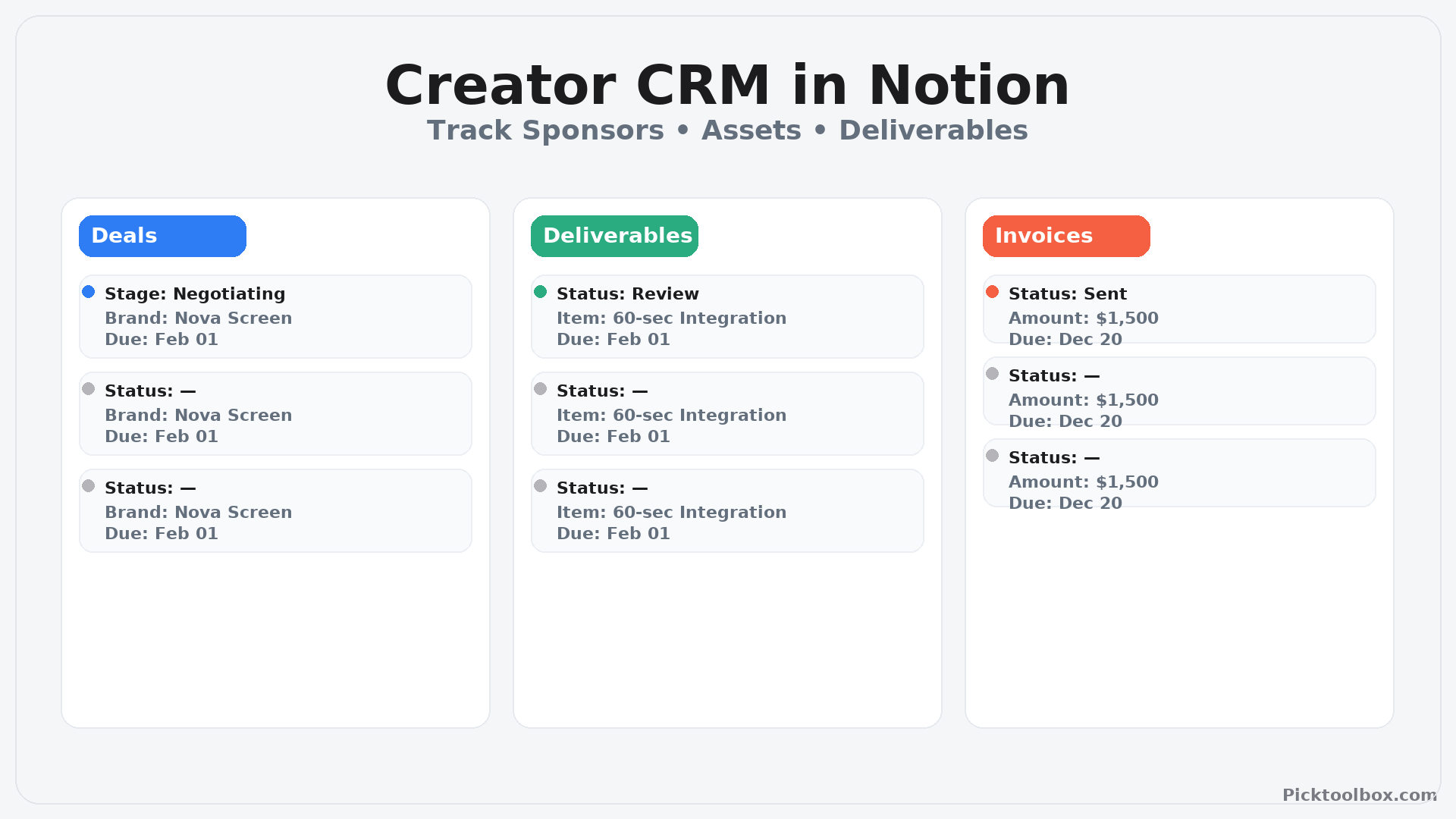 A clean, reliable Creator CRM in Notion lets you see every sponsor, contact, deliverable, invoice, and file in one place—so nothing slips and no payment gets “forgotten.” This guide gives you a practical data model (7 small databases), the exact relations/rollups/formulas, daily/weekly routines, and copy-ready templates. Build it once; ship stress-free deals all year.